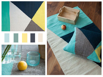 It is a cozy and contemporary collection, ideal for the living room or any place of your house. With the wool natural colors warmness and the geometric and linear patterns in blues and mustards made the perfect balance for a modern home decor.